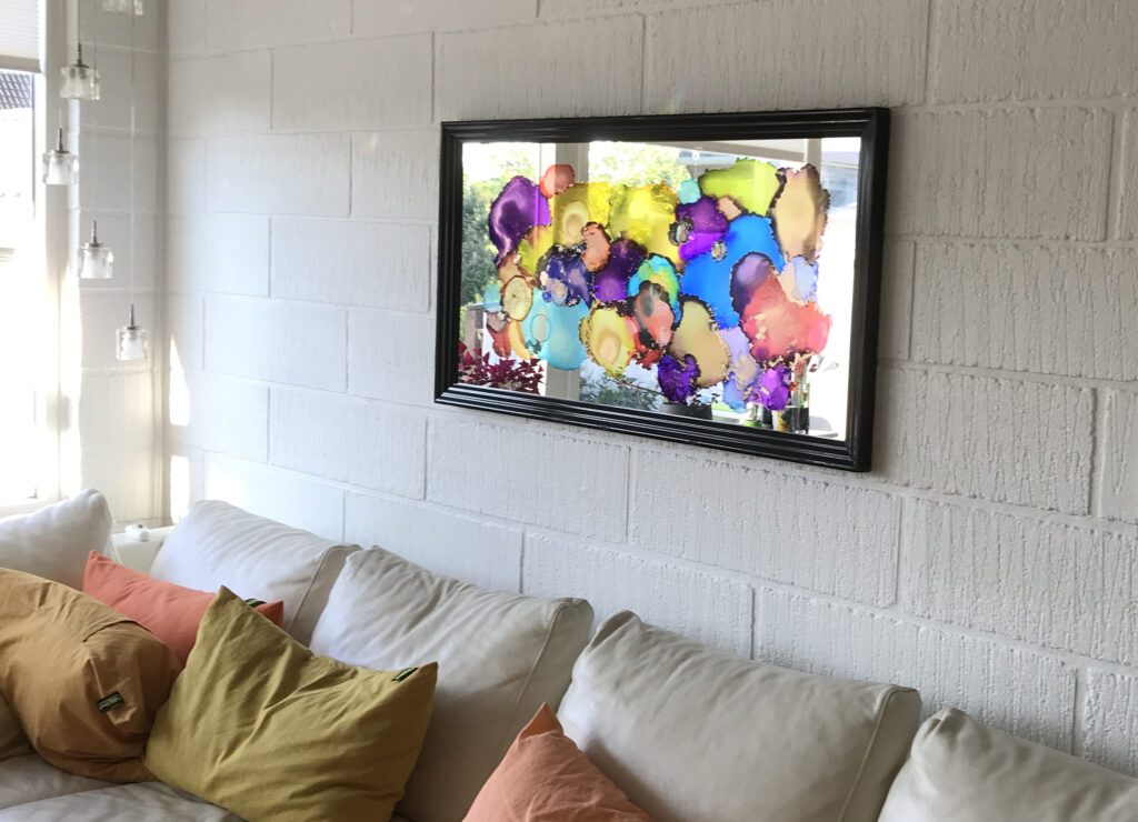 Transparent alkohol ink på spejl. Et fantastisk farveskift udspiller sig når man går forbi det, da farverne changerer når lyset falder forskelligt på det og spejlet afspejler resten af lokalet.